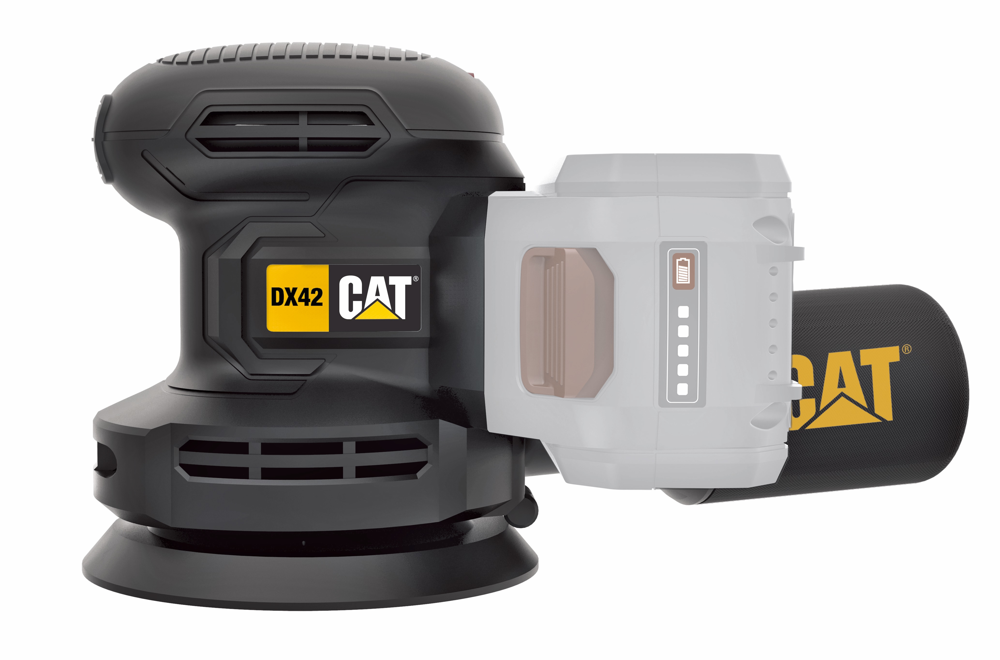 Cat DX42B CAT 18V 125mm Orbital Rotary Sander Featuring Sanding and polishing 2 in 1 function, Hook and loop & clamp system, Variable speed control, Dust collection system, On/off switch, Pad brake system and Rubber over mould grip. Accessories: 1pc Dust bag, 3pc Sanding paper(60#/80#/120#) and 1pc 150mm polishing foam pad. (Battery & Charger not Included)