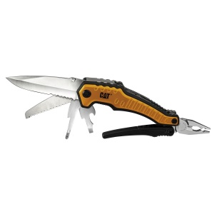 Double Injected Dual Colors For Big Arm, The Other Small Arm With Single Injected Grip. 3Cr13 Stainless Steel For Accessories. Functions Consist Of: 1.Long Nose Pliers 2.Wire Cutters 3.Crimpers 4.Large Knife Serrated Blade 5.Saw Blade 6.Single Cut File 7.Bottle Opener 8.Phillips Screwreiver 9.Slotted Scredriver Sanding Processing Finish. With A Micro Injected Cat Rubber Label Sticks To Each Side Of The Big Arm. With Thumb Stud And Line Lock For Knife Blade/Saw Blade. Closed Length:6-3/8" Overall Length:12-1/4" With a Deluxe Hard(Foam Pad) Pouch For Storage